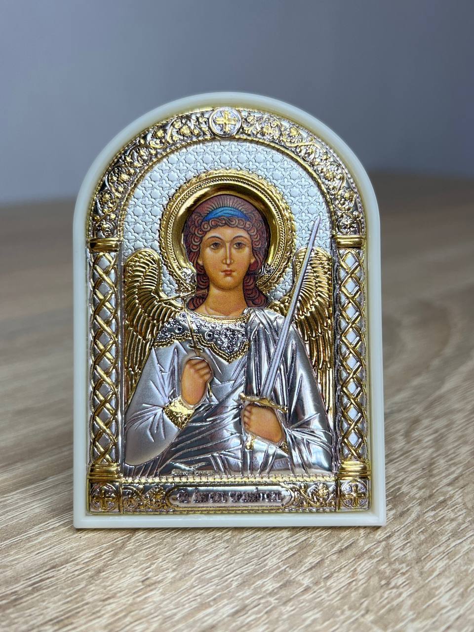 Ангел хранитель, икона арочная, пластик белый 80х115мм. серебряная Греческая.