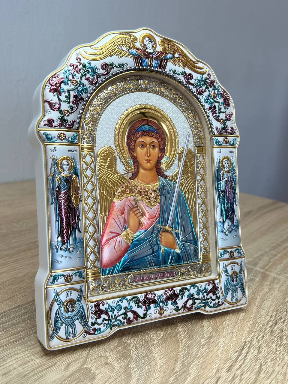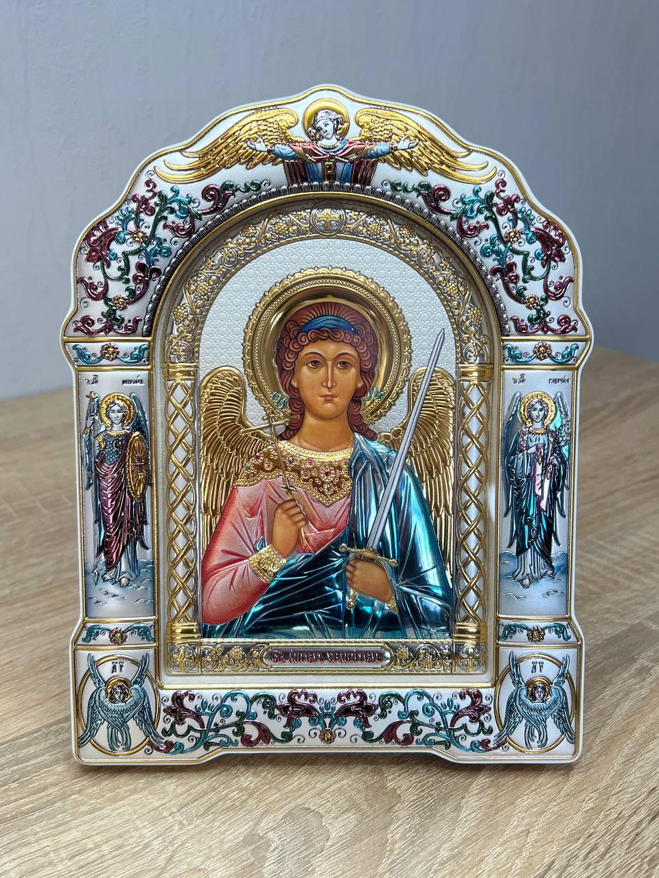 Ангел Хранитель, икона арочная с рамкой, белое дерево, эмаль 167х228мм серебряная Греческая.