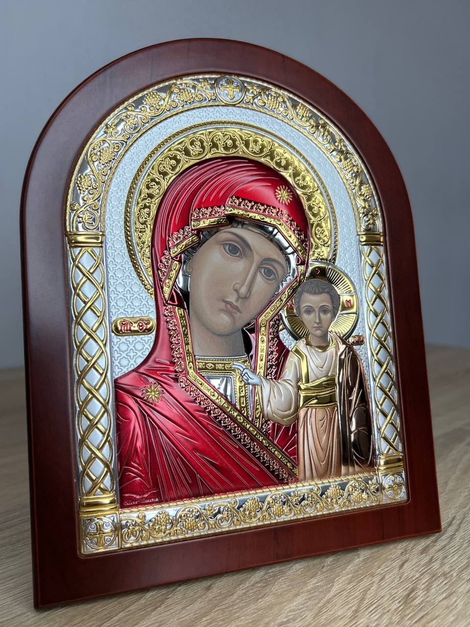 Казанская БМ, икона арочная, красное дерево, эмаль 206х275мм серебряная Греческая.