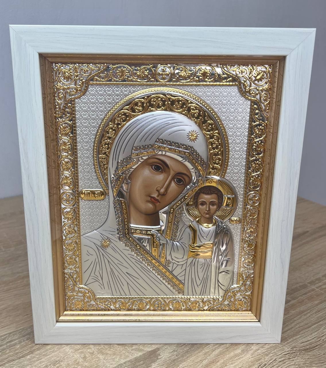 Казанская БМ, икона прямоугольная в рамке под стеклом, белое дерево 170х210мм серебряная Греческая.