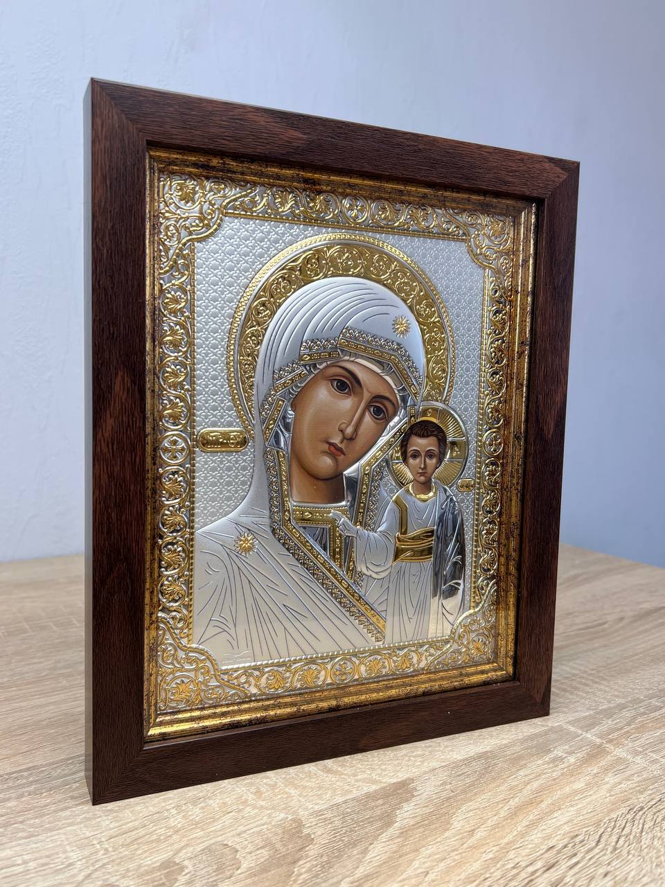 Казанская БМ, икона прямоугольная в рамке под стеклом, красное дерево 170х210мм серебряная Греческая.