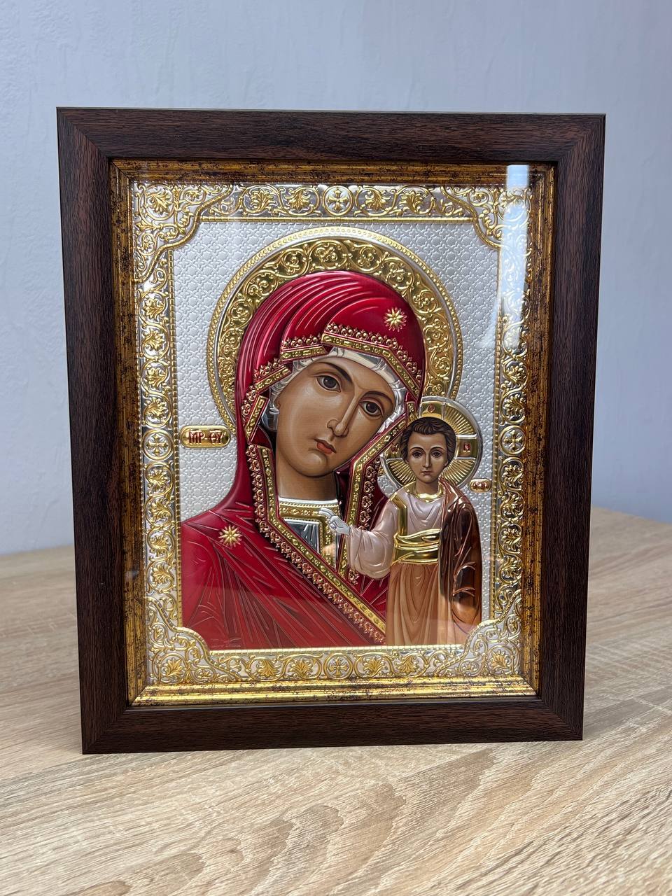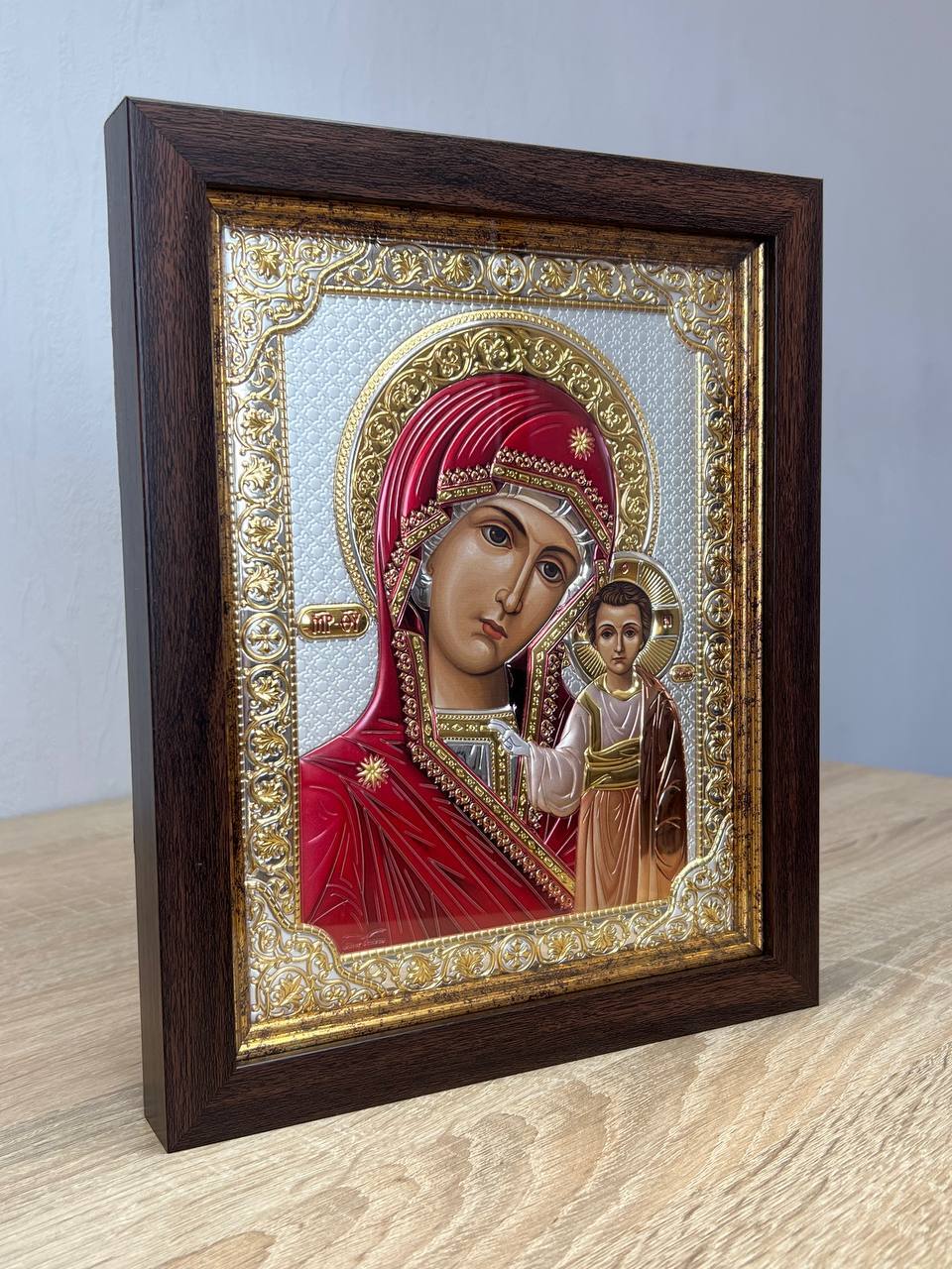 Казанская БМ, икона прямоугольная в рамке под стеклом, красное дерево, эмаль 170х210мм серебряная Греческая.