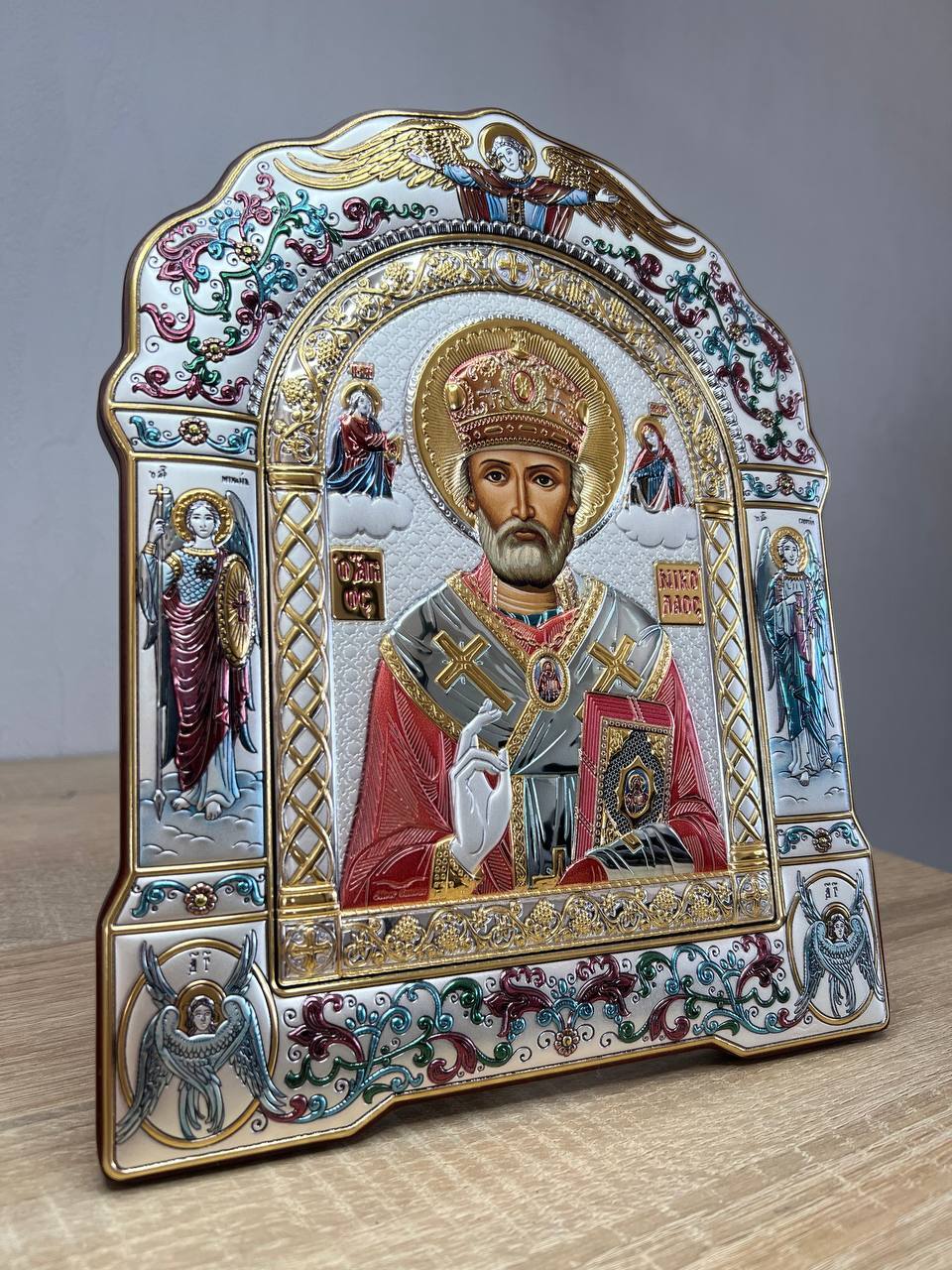 Николай Чудотворец, икона арочная с рамкой, белое дерево, эмаль 167х228мм серебряная Греческая.
