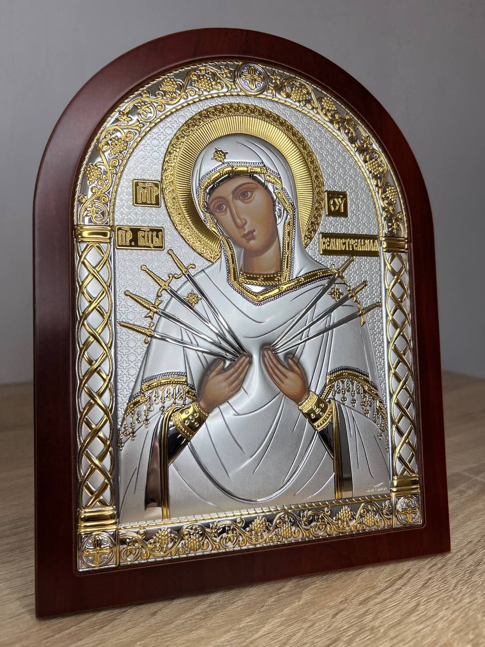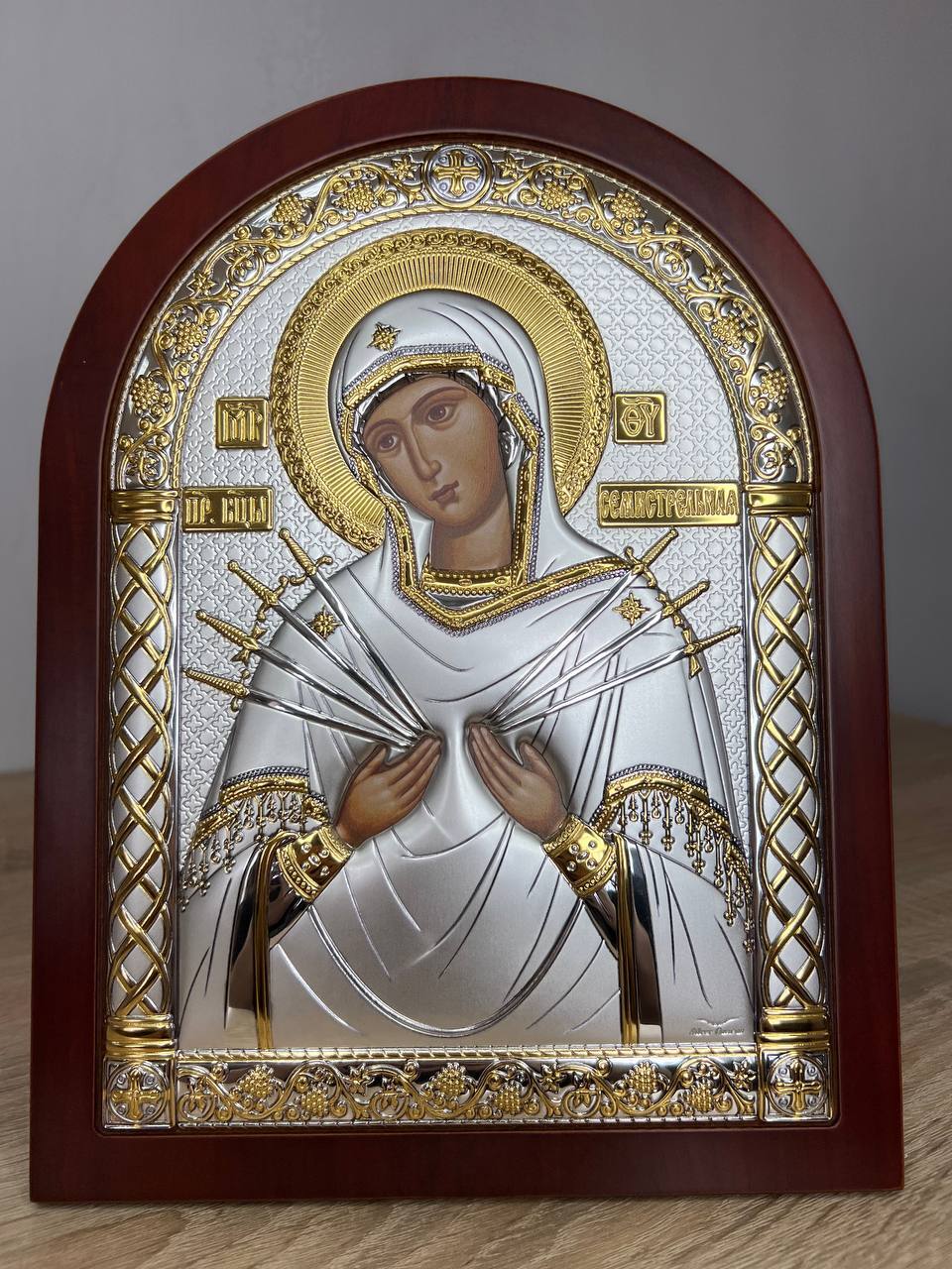 Семистрельная БМ, икона арочная, красное дерево 105х140мм серебряная Греческая.
