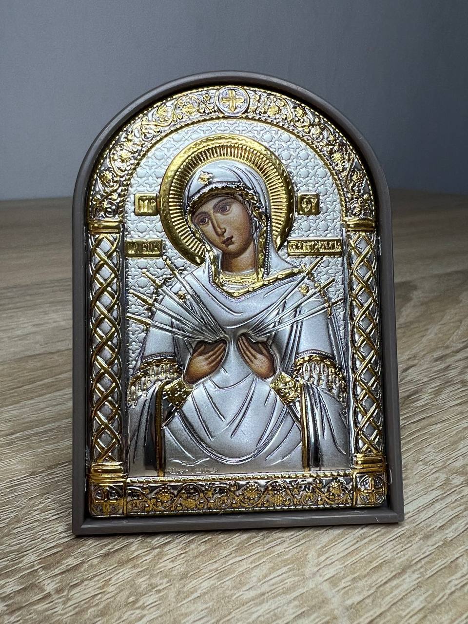 Семистрельная БМ, икона арочная, пластик коричневый 48x69мм серебряная Греческая