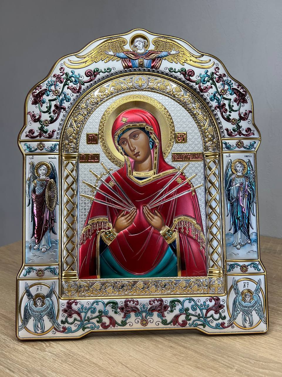 Семистрельная БМ, икона арочная с рамкой, белое дерево, эмаль 167х228мм серебряная Греческая.