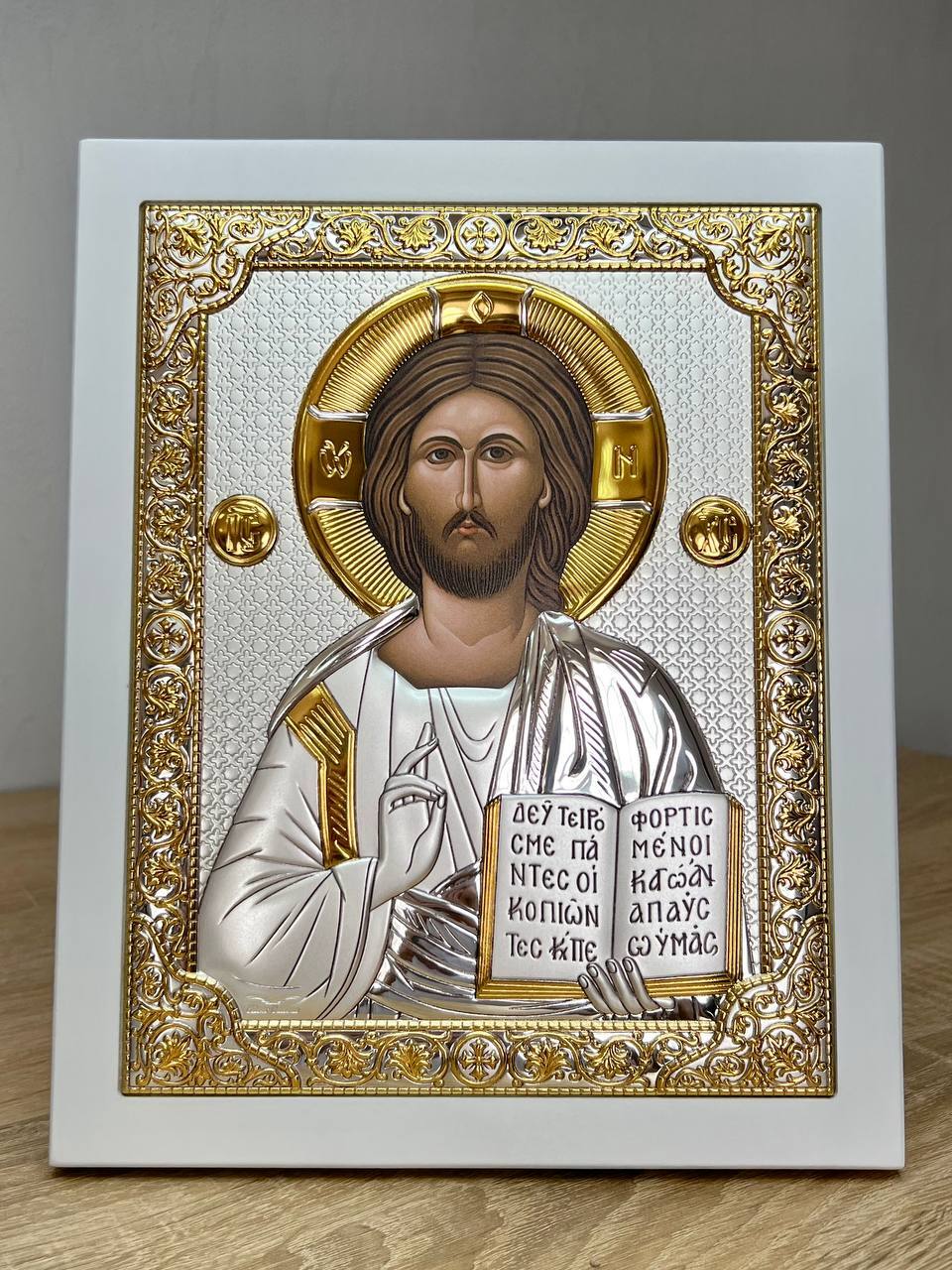 Спаситель, икона прямоугольная с рамкой, белое дерево 150х190мм серебряная Греческая.