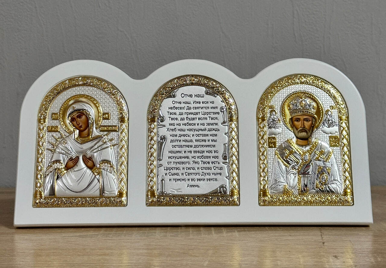 Триптих, Семистрельная БМ, Николай, Молитва, икона, белое дерево 320х160