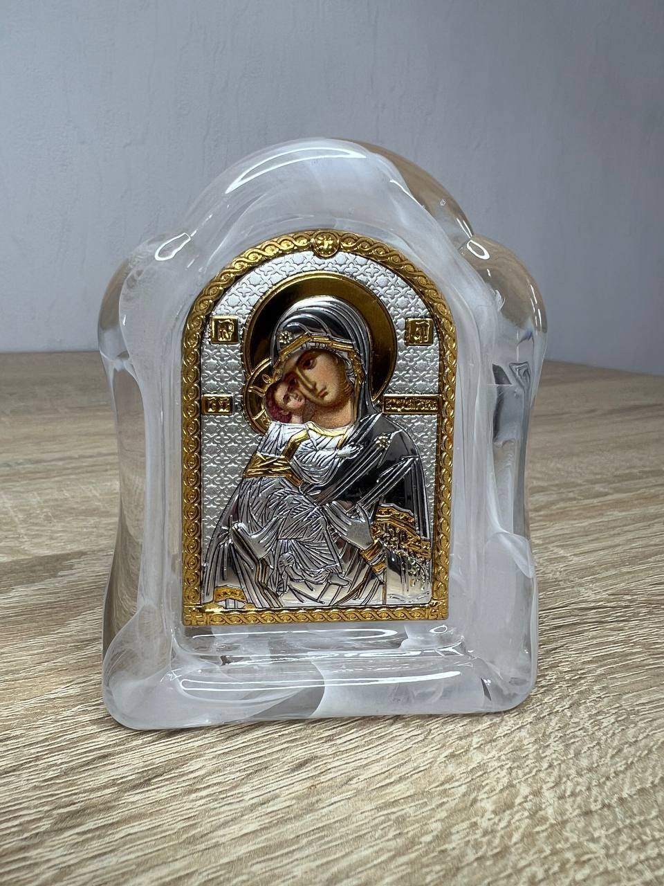 Владимирская БМ, икона арочная, белое муранское стекло 65х85мм серебряная Греческая.